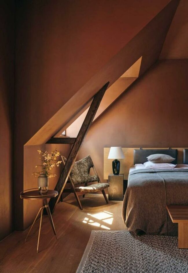 Brown walls and wooden floors create a calm, inviting bedroom retreat that feels like a peaceful sanctuary after a long day.