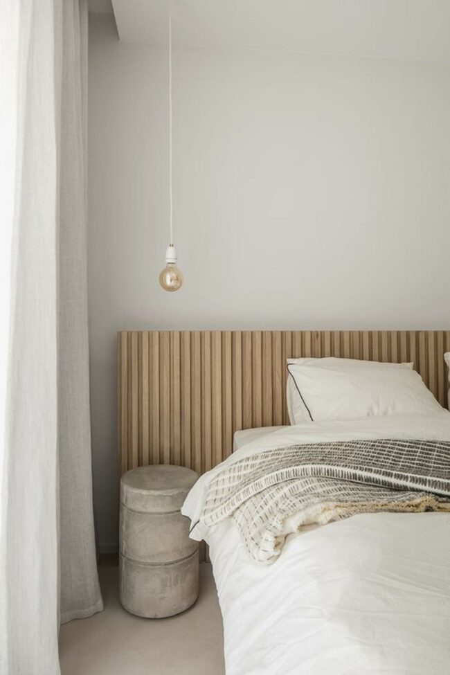 Wood and concrete blend perfectly in this bedroom, creating a modern yet natural atmosphere that feels inviting and calm.