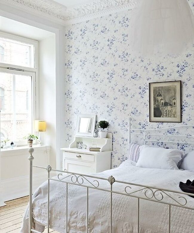 Blue floral patterns dance across the white walls, perfectly complementing the elegant metal bed frame with its delicate details.