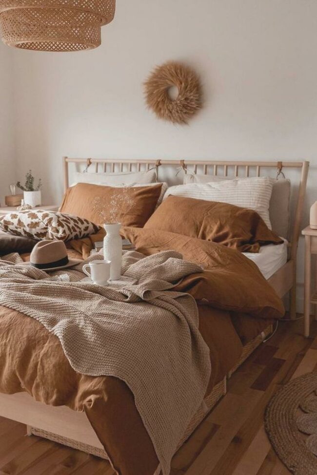 Beige bedding paired with rust-colored pillows strikes the perfect balance between neutral and bold design choices.