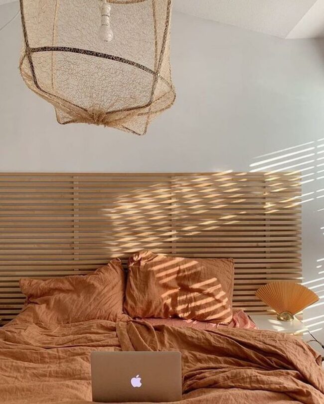 Dazzling rays of sunlight dance through blinds across the wooden headboard, creating a perfect balance between light and shadow in this restful space.