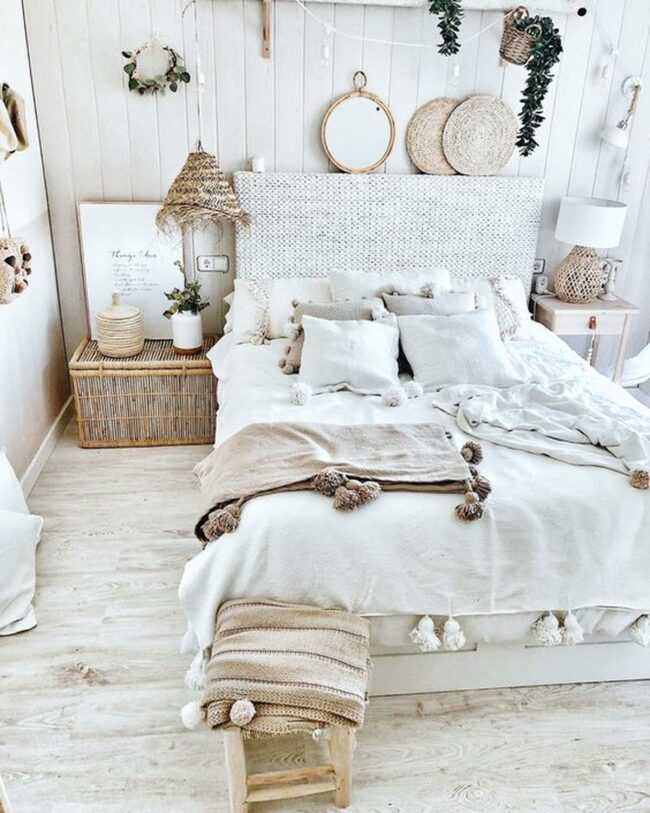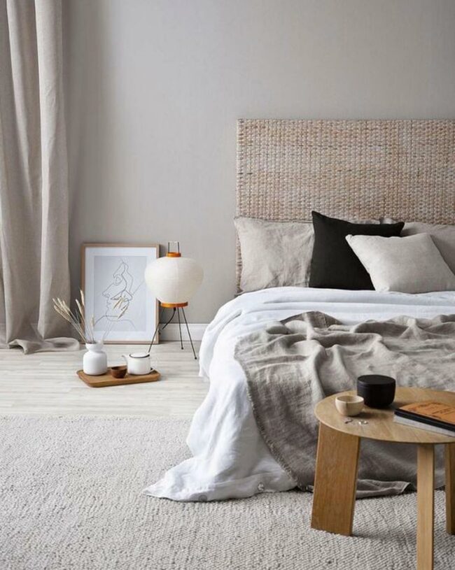 The natural texture of the woven headboard serves as an eye-catching focal point that complements the surrounding beige walls perfectly.