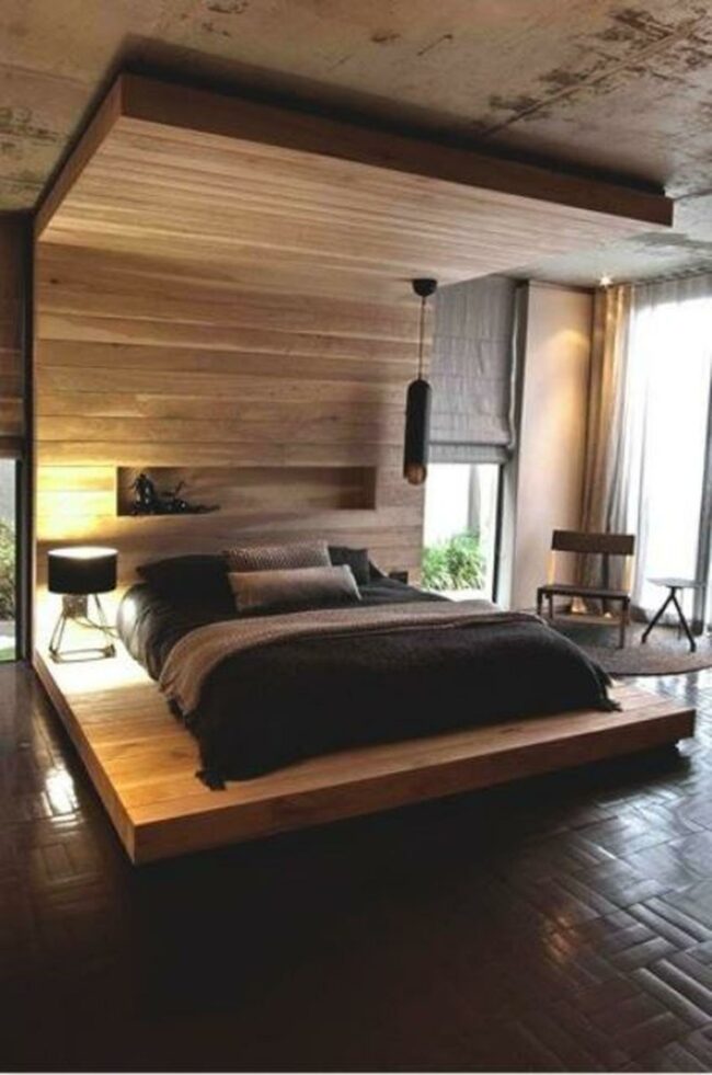 The bed sits on a low wooden platform with dark bedding that gives the space a minimalist appeal without trying too hard.