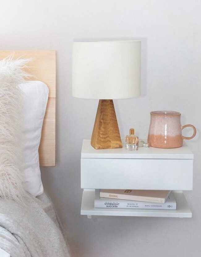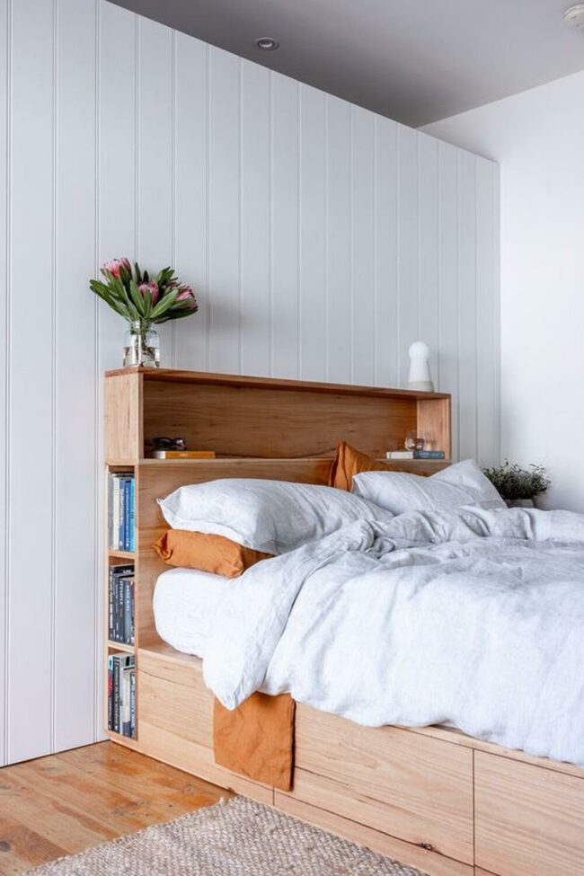 Simple vases and dried plants arranged on the headboard shelf bring subtle life elements into the space without requiring maintenance.