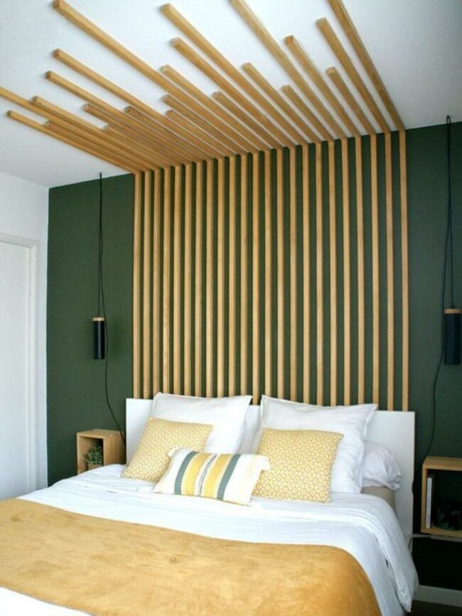 Natural wooden slats extend from behind the bed to the ceiling, giving the room a distinctive architectural feature without overwhelming the space.