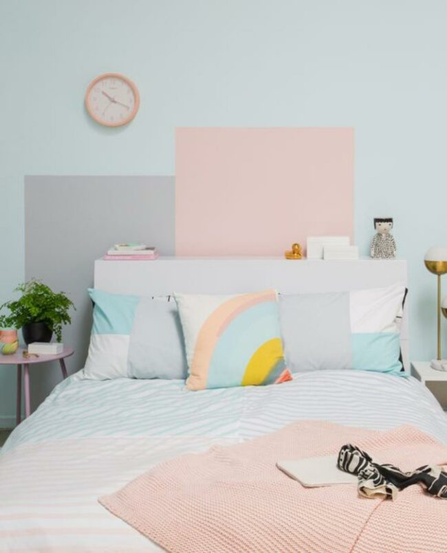 Blue walls create a peaceful backdrop for this bedroom, which features a striking pink and gray color-blocked design behind the bed.