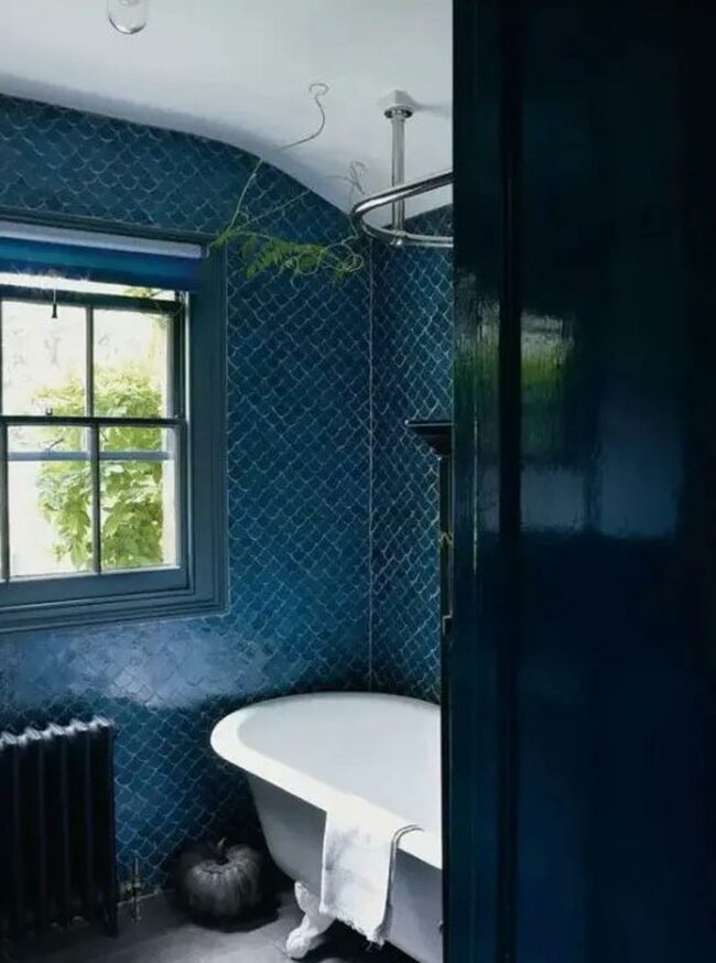 Bathroom colors are the star of this serene space, with deep blue scallop tiles creating a tranquil atmosphere.