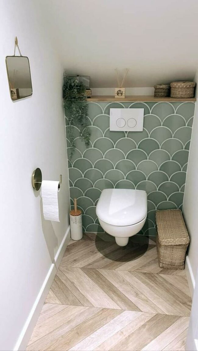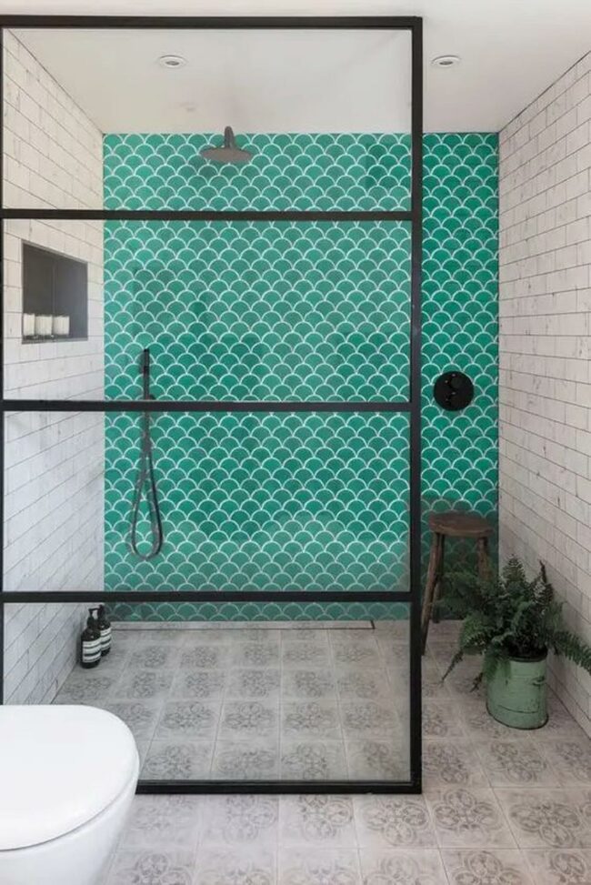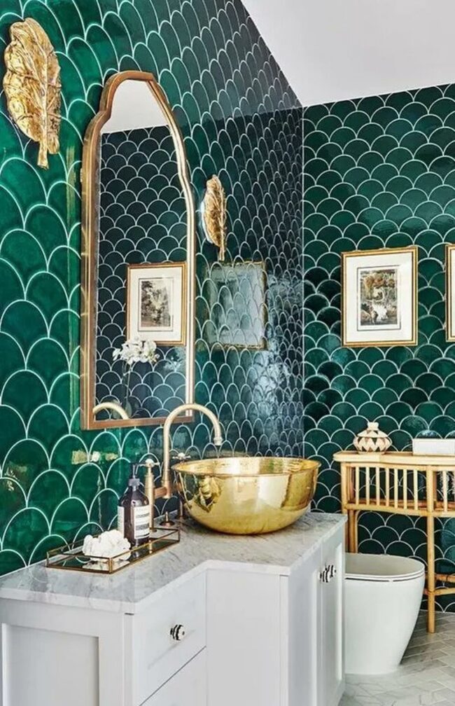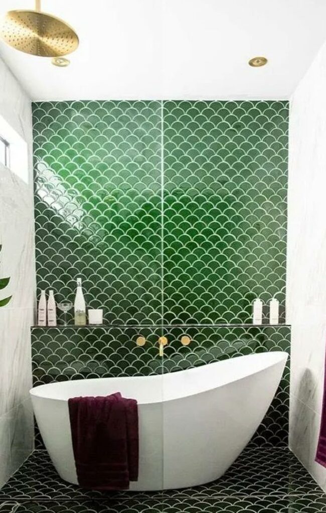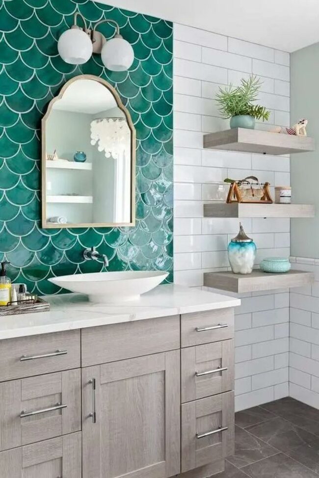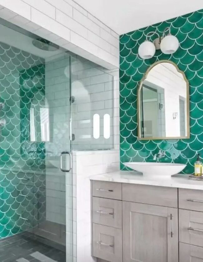 Green fish-scale tiles are the star of this bathroom's refreshing design, creating a serene atmosphere that instantly soothes you.