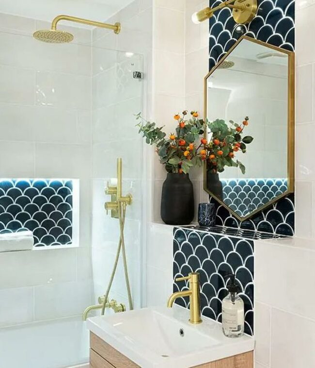 Dark blue scalloped tiles introduce dramatic visual interest behind the sink and shower niche, creating depth and character.