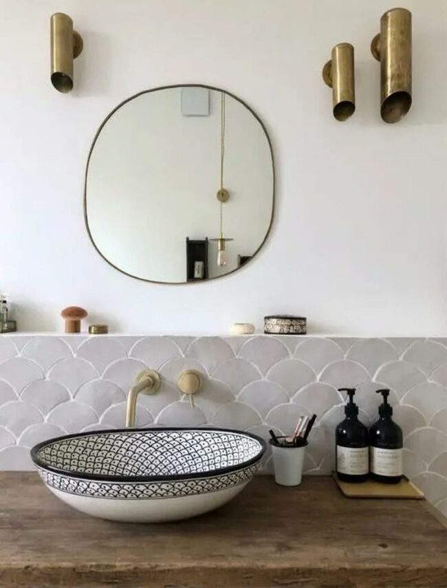 Scalloped tiles cover the wall behind the sink, adding gentle texture and a subtle shine that catches the eye.