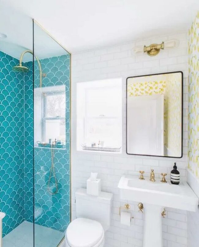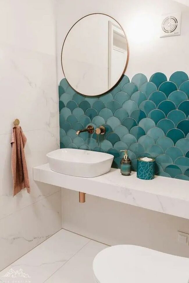 Teal fish-scale tiles are the showstopping centerpiece of this bathroom, creating an instant eye-catching focal point that energizes the entire space.