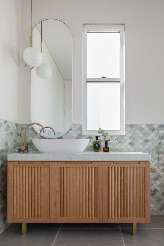 Fish-scale tiles are the showstopping centerpiece of this bathroom, bringing a playful and refreshing marine vibe to the space.
