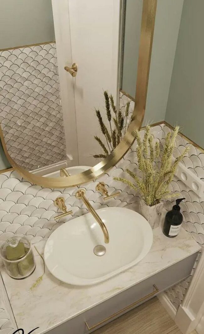 Gold-toned faucets and a rounded mirror with metallic edges bring warmth and sophistication to the room.
