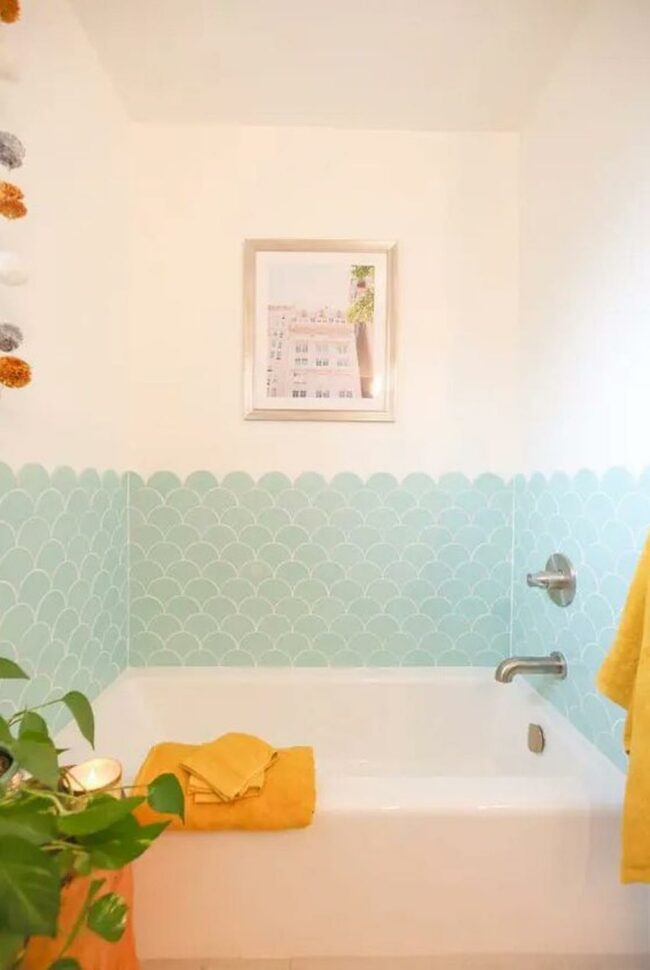 Unique fish-scale tiles around the bathtub splash cool aqua colors across the room, adding unexpected personality.