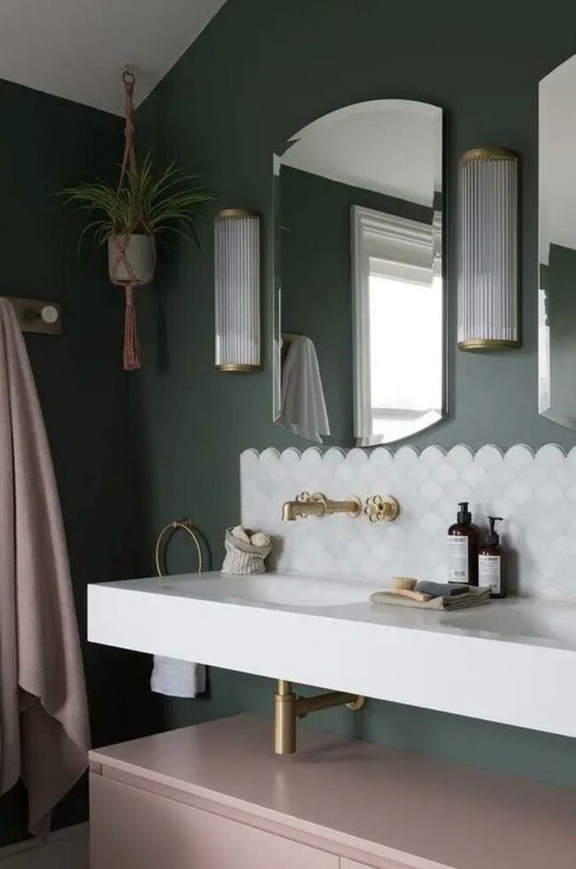 Rich green tiles and gold accents create a harmonious, sophisticated environment that feels both modern and inviting.