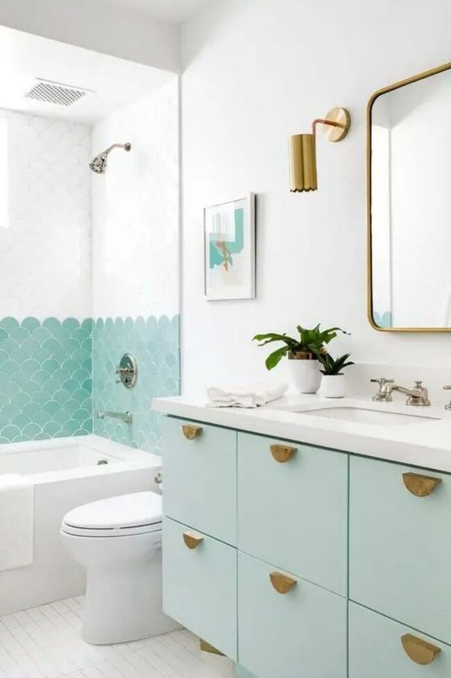 Brass handles on drawers and matching wall lights introduce warm metallic tones that complement the refreshing color scheme.