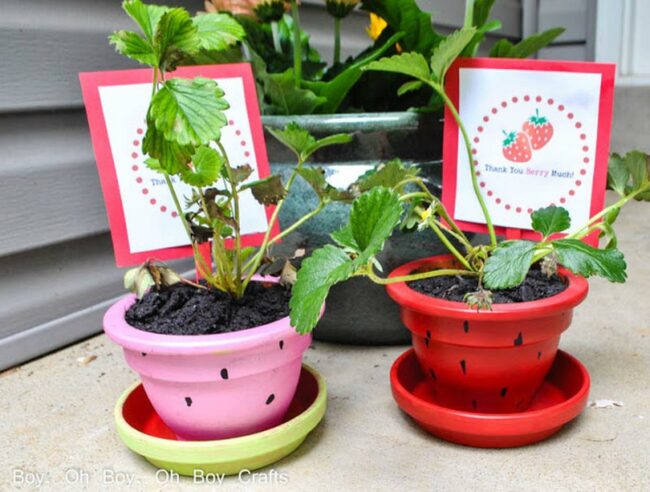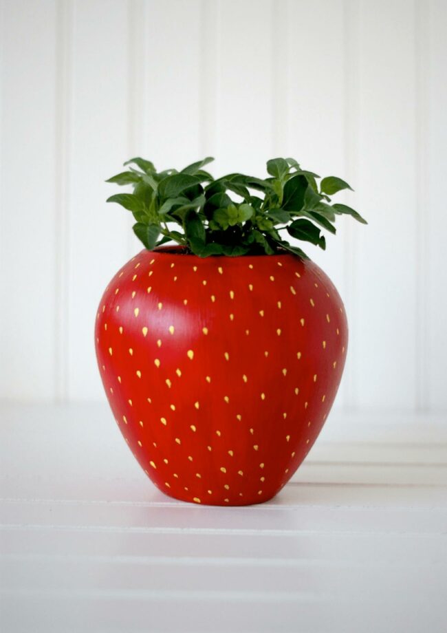 Playful textures and colors make these strawberry plants a perfect decoration for porches or garden areas.
