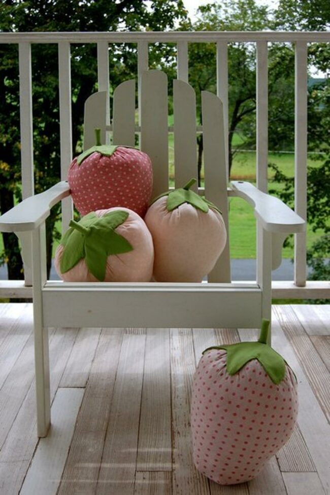 Plush pillows in pink and cream mimic real strawberries with their delicate green leafy tops.