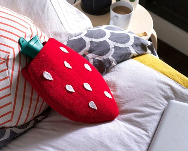 Strawberry-shaped red hot water bottles add quirky charm to soft white bedding.