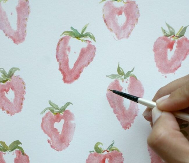 Artists use thin brushes to craft unique strawberry shapes with soft pink and light red hues.