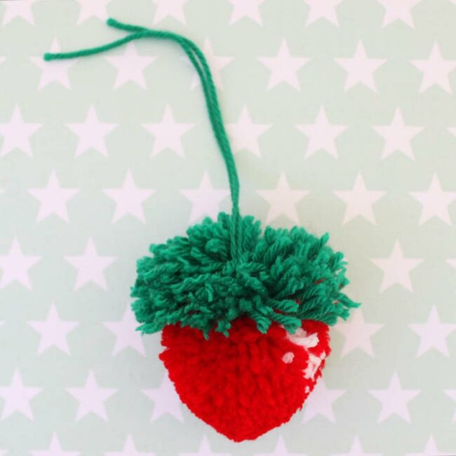 Green yarn pieces cleverly form the leafy strawberry top, adding realistic texture.