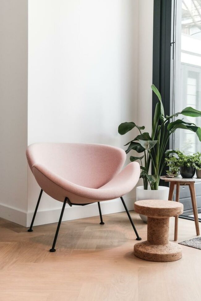 A delicate pale pink chair with sleek black legs introduces a soft color accent that adds modern sophistication.