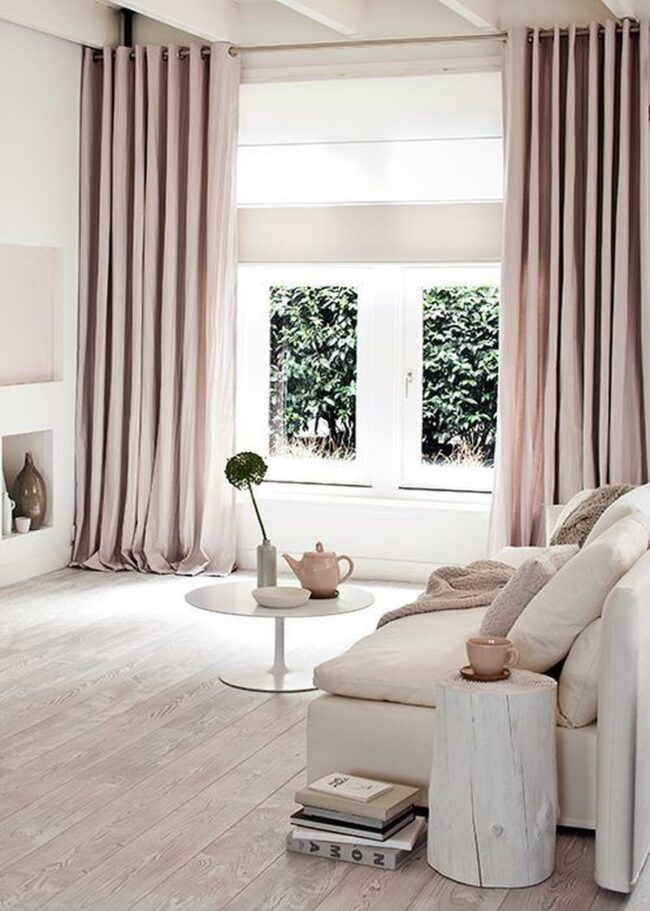 Light streams through tall windows draped in gentle pink curtains, instantly warming the space.