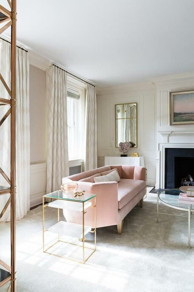 Pink velvet sofas are the heart of this chic living space, offering a luxurious focal point with clean lines and light wooden legs.