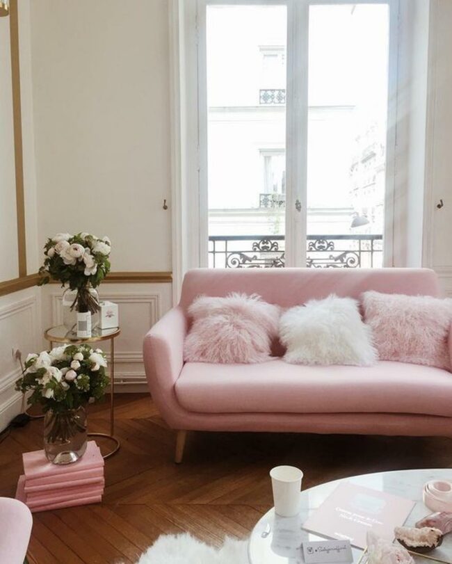 Fluffy white and pink pillows scatter playfully across the couch, adding delightful texture.