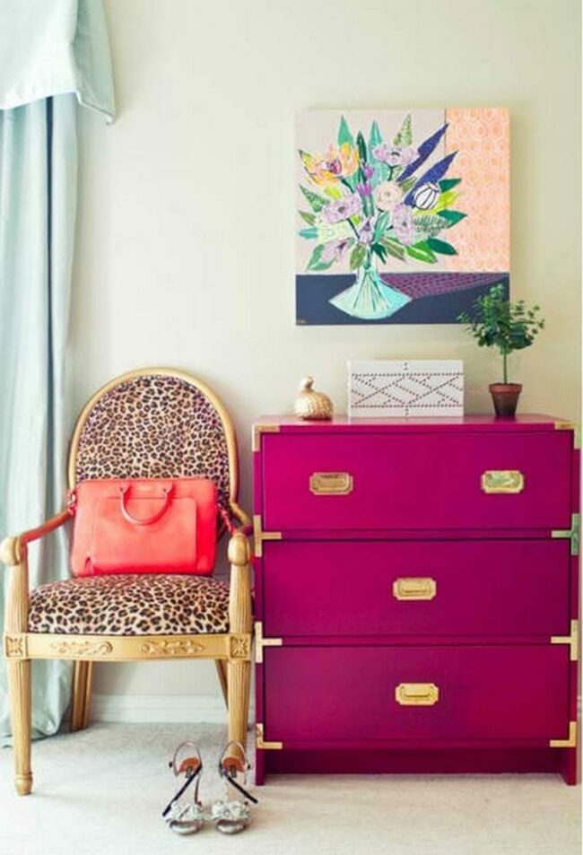 Magenta dresser with gold handles is the showstopper of this vibrant corner space.
