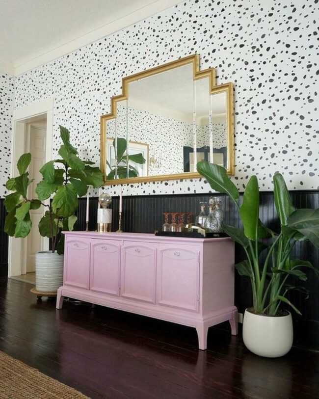 Room designs spark excitement with a bold black and white spotted wall that instantly energizes the space.