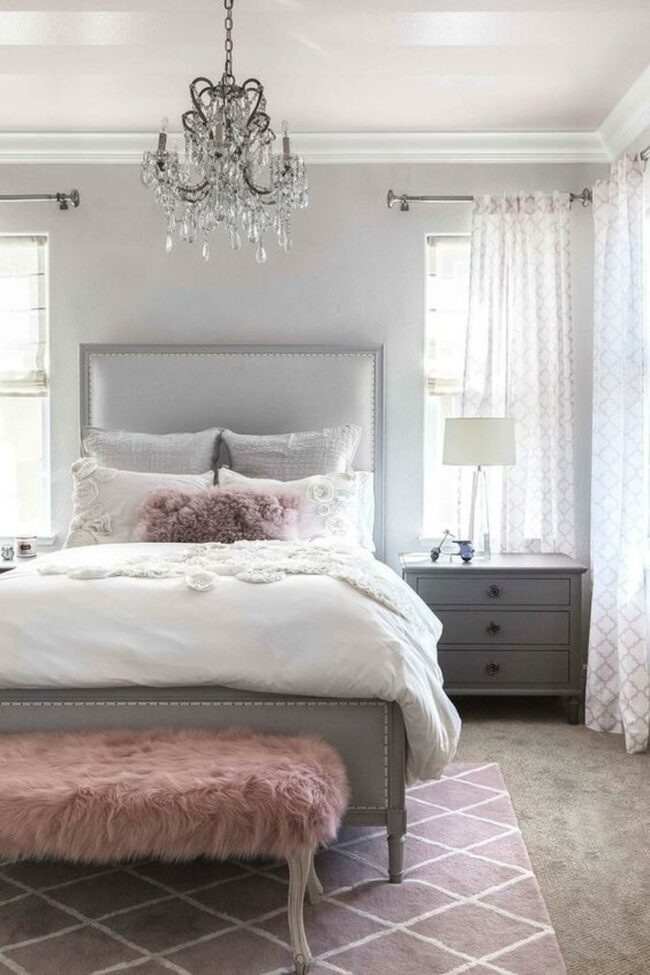 Gentle gray and blush pillows with a cozy throw blanket make the bed feel inviting and comfortable.