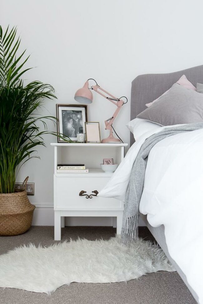 Gray nightstands complement the neutral color scheme while displaying charming decor pieces.
