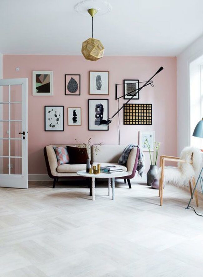 Soft pink walls transform this living room into a welcoming sanctuary that radiates comfort and style.