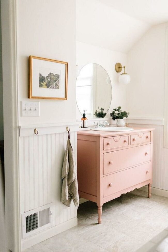 Delicate pink tones of the cabinet soften the overall aesthetic, making the bathroom feel inviting and serene.