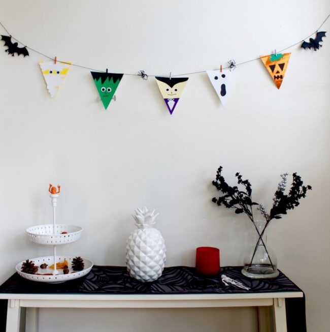 Colorful handmade banners stretch across the wall, creating an instant party atmosphere.