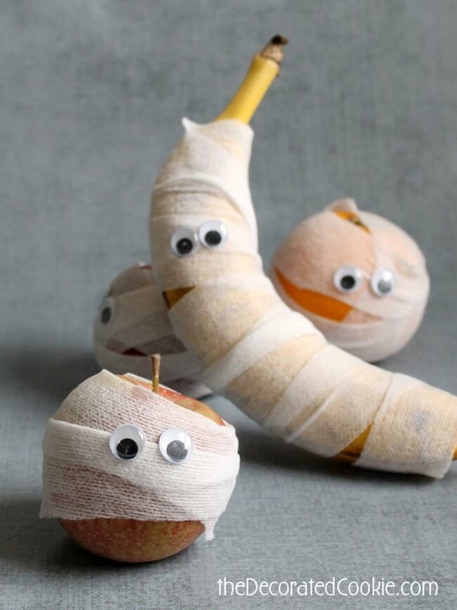 Fruit mummies are a whimsical Halloween treat that transforms ordinary produce into spooky characters.