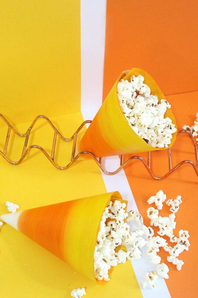 Orange and yellow cones hold fluffy kernels in an artistic arrangement.