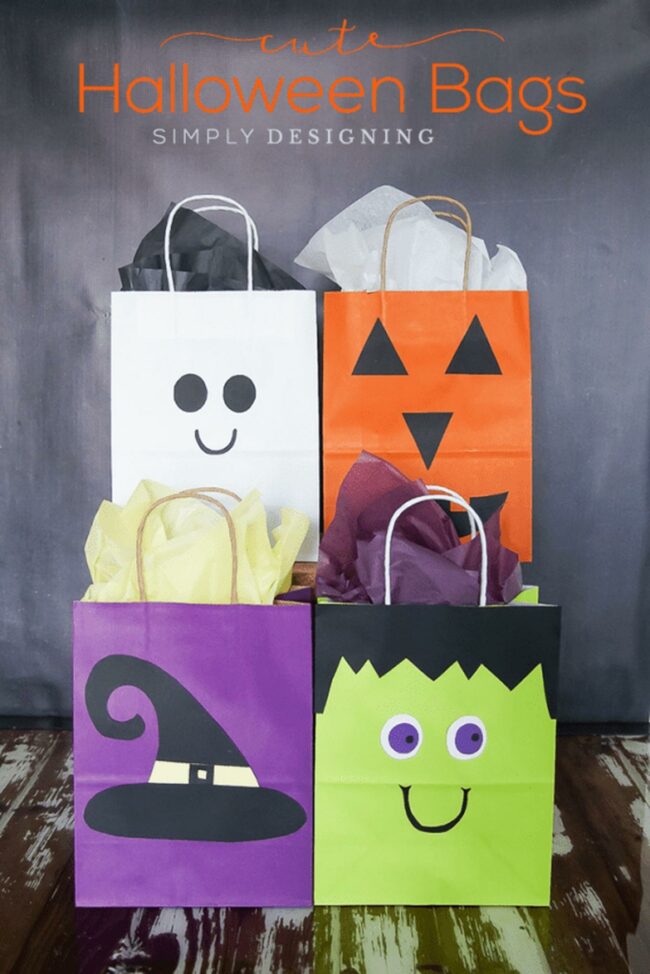 Orange bags showcase classic jack-o'-lantern faces using simple black triangle eyes and grins that make you smile.