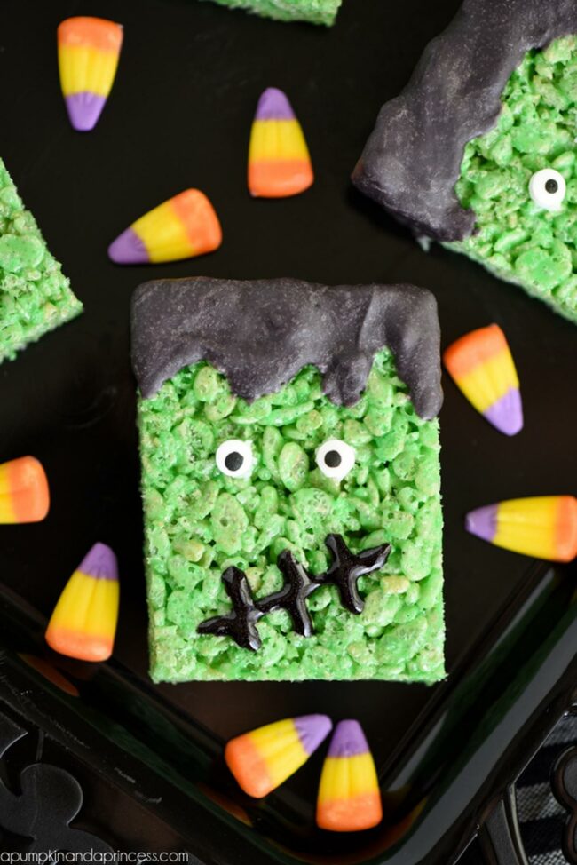 Green bags transform Frankenstein's monster into an adorable character with cute zigzag hair and friendly eyes.