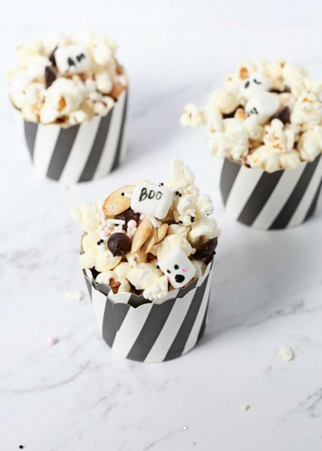 Small black and white striped cups showcase the mix of fluffy popcorn and sweet marshmallow friends.
