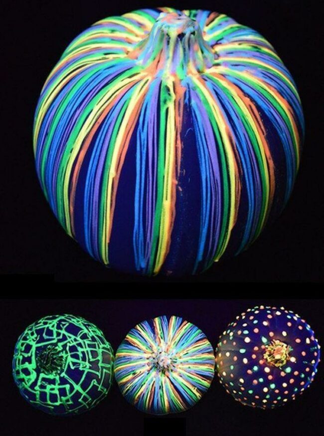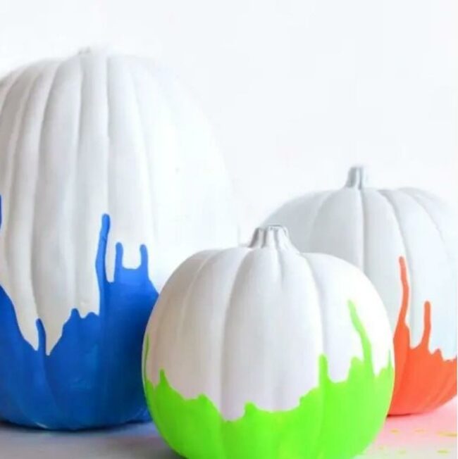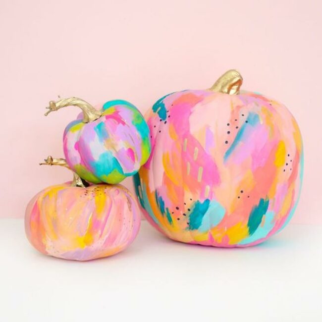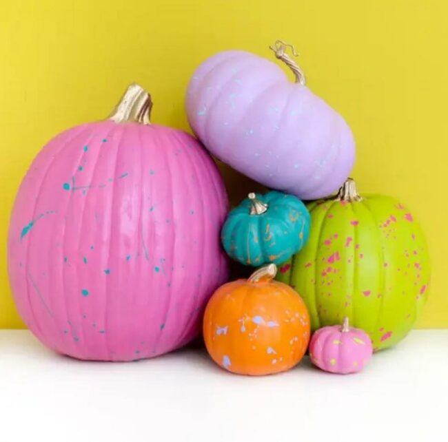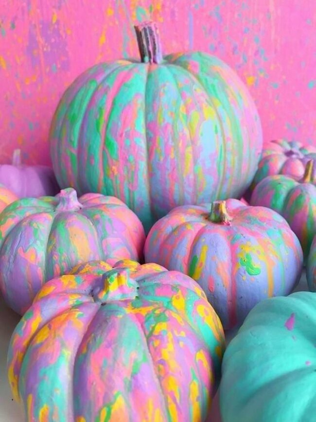 Splashes of pink, green, yellow, and blue dance across the pumpkin surfaces like melting paint drips.
