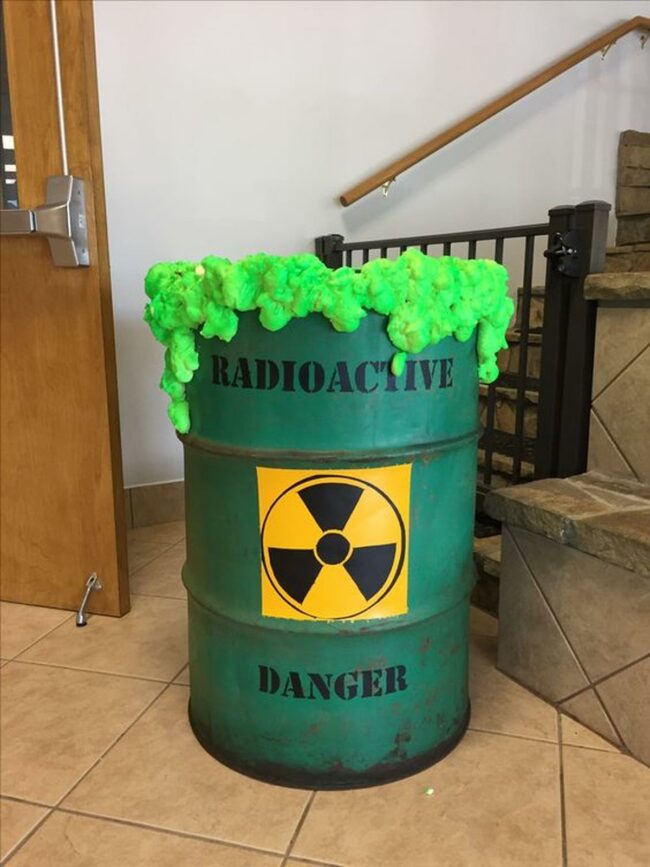 Green radioactive barrels are the dramatic centerpiece of this unusual space.