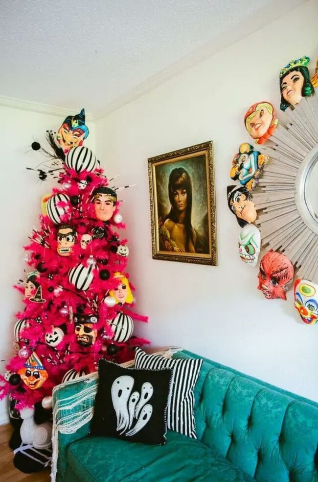 Pink Christmas tree branches burst with spooky and striped ornaments, making this decor uniquely eye-catching.