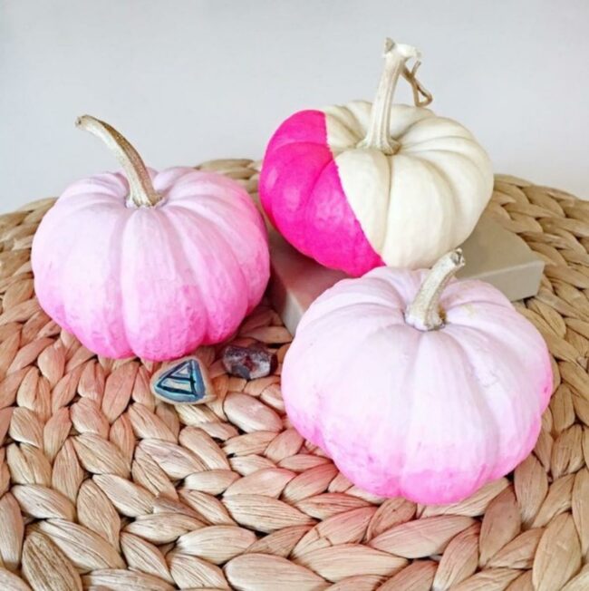 Pink tones dominate the scene, with two pumpkins fully covered in soft rose hues and one sporting a creative half-and-half design.