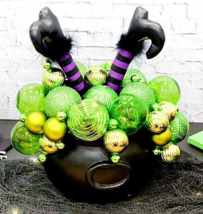Witch legs peeking dramatically from a black cauldron create a whimsical scene that makes people smile.