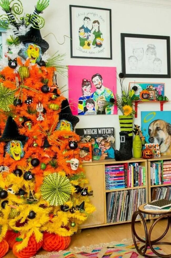 Orange and yellow decorations splash color across branches adorned with witchy, catlike, and skull ornaments.
