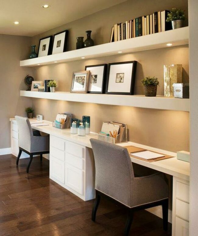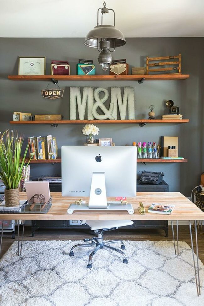 Working together becomes a joy in this modern space where wooden shelves and a wall-mounted desk create a tidy, open feel.