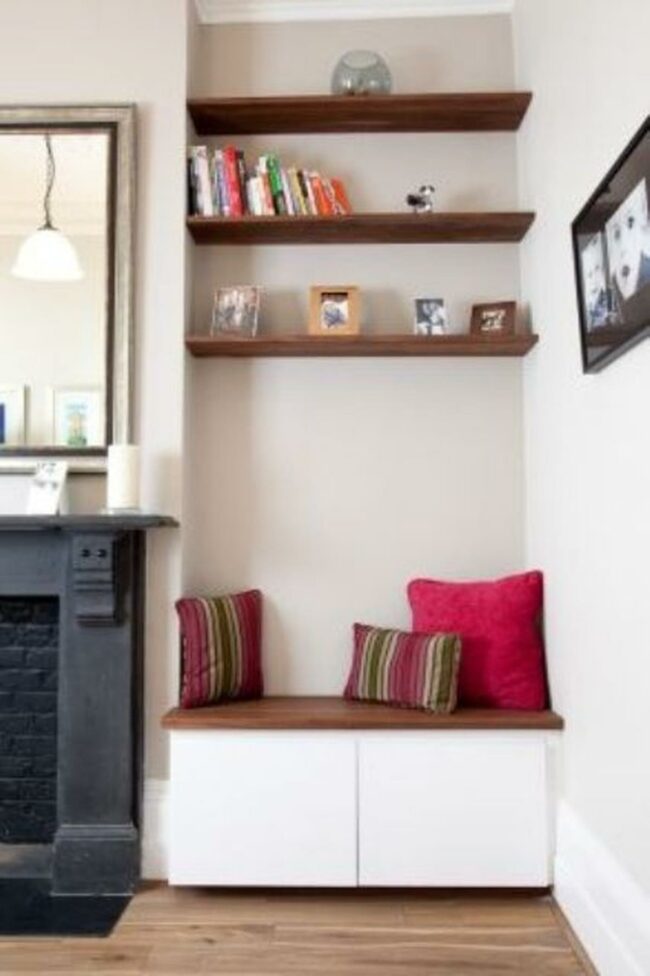 Above, cleverly placed floating shelves display a curated collection of books, personal photos, and small green plants that bring a touch of nature indoors.