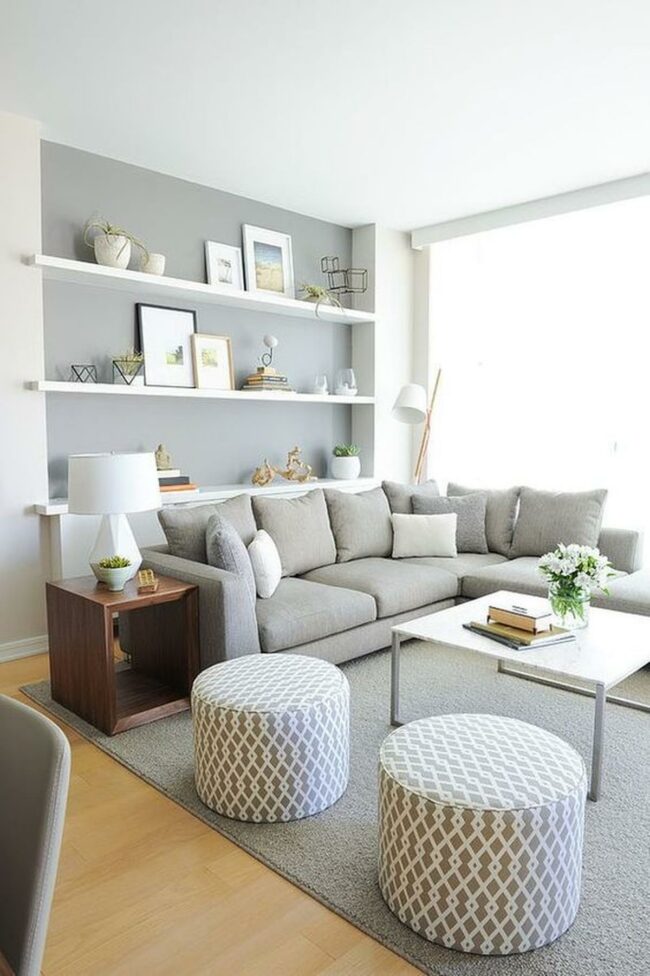 White floating shelves display carefully chosen art and books, giving the room character while maintaining its uncluttered appeal.